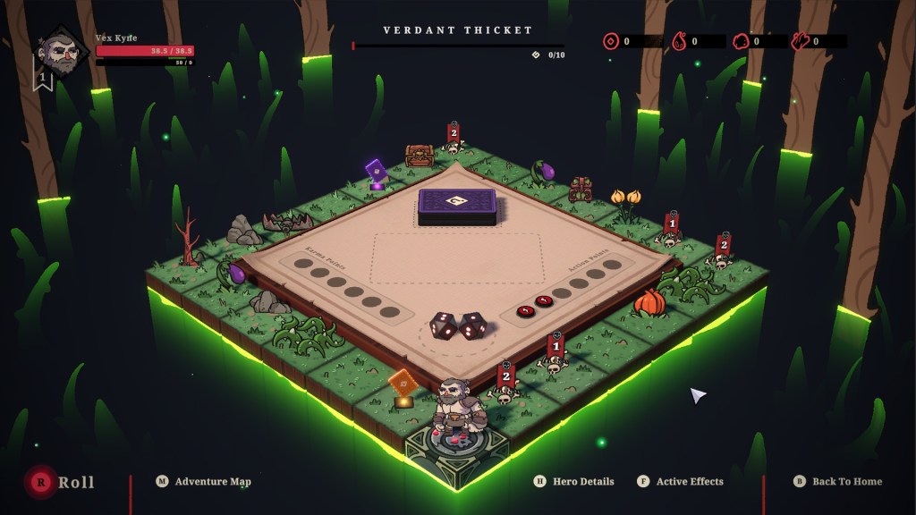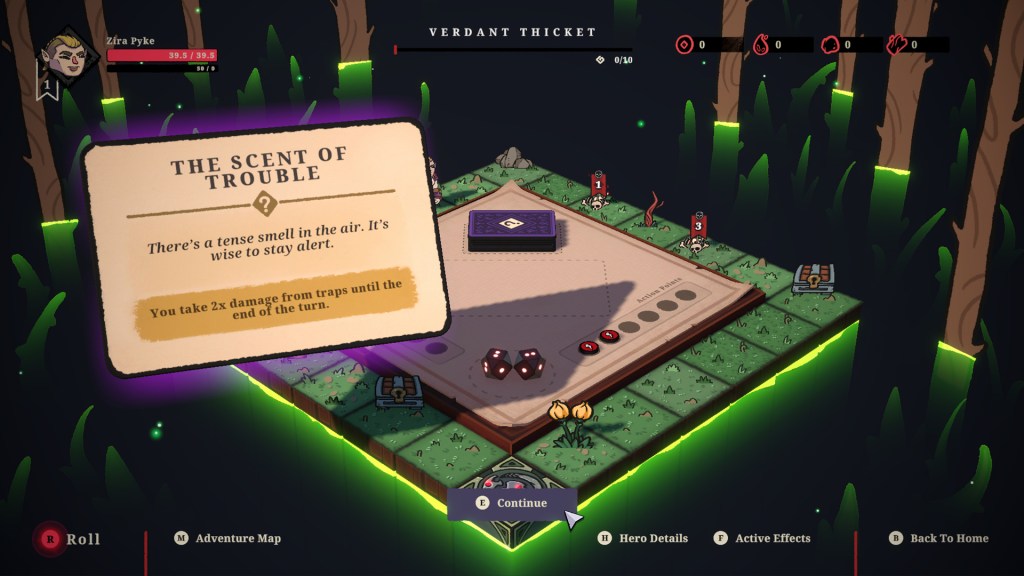 Roll the dice to move across tiles, encountering traps, treasure, events, and enemies as you go.